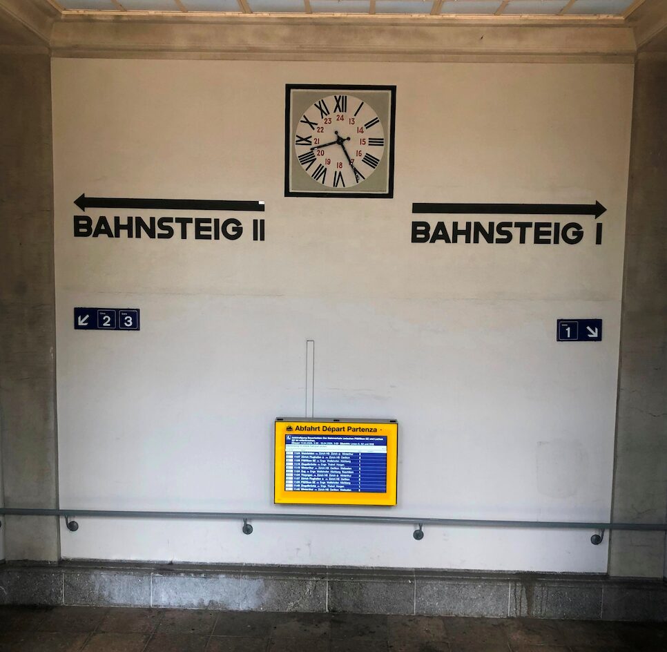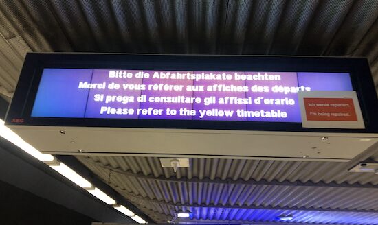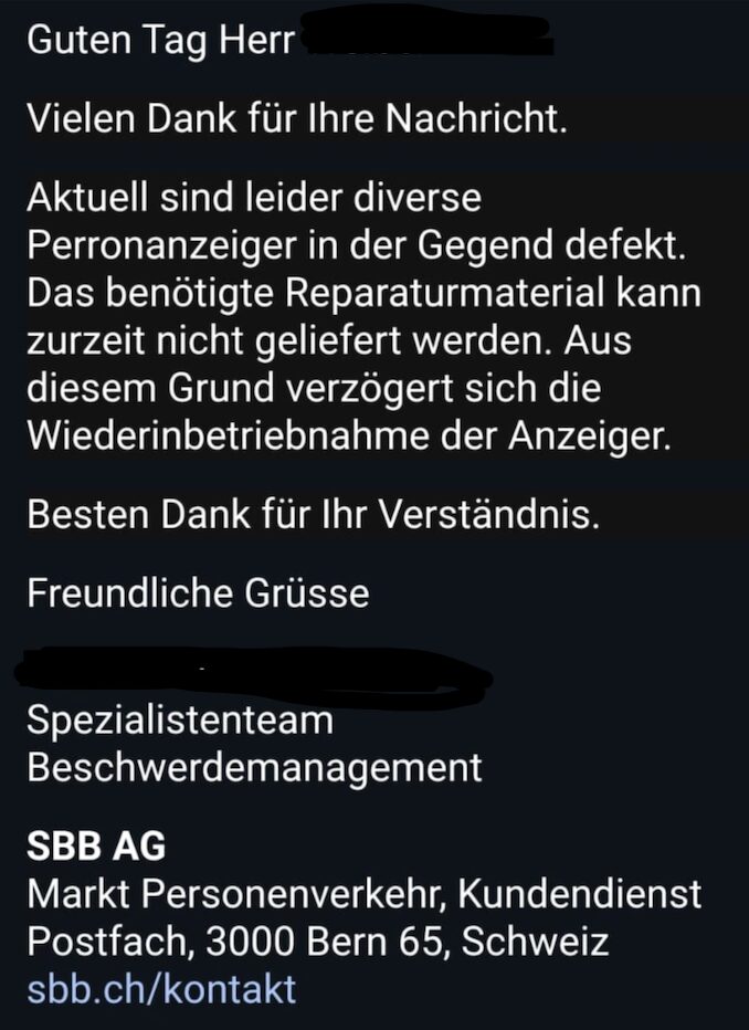 Als Antwort auf eine Reklamation bestätigen die Bundesbahnen lapidar, dass in der Gegend diverse Perronanzeiger defekt sind. Das benötigte Reparaturmaterial könne zurzeit nicht geliefert werden.