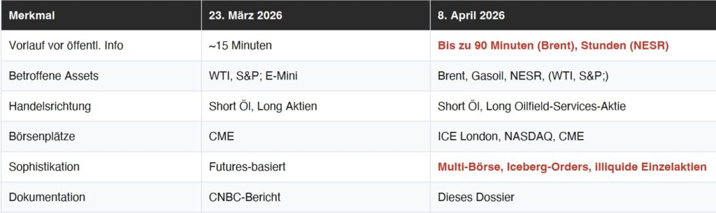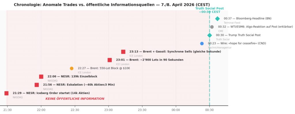 Diese Muster sind konsistent mit einem am 23. März 2026 von CNBC dokumentierten Vorfall, bei dem anomale Volumen-Spikes vor einer Trump-Ankündigung zu Iran nachgewiesen wurden.