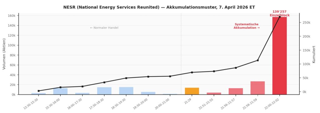 Parallel wird in der illiquiden Einzelaktie NESR (Oilfield Services, Naher Osten) ab 21:29 ET eine Position von ~USD 5 Mio. über 30 Minuten systematisch aufgebaut – Stunden vor jeder öffentlichen Information.