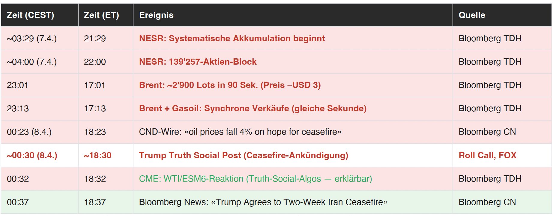 Anmerkung zur Einordnung: Die an der CME registrierten Volumenspikes in WTI-Futures und S&P-500-Futures (ab 00:32 CEST) erfolgten rund 2 Minuten nach dem Truth-Social-Post und sind mit hoher Wahrscheinlichkeit auf Algorithmen zurückzuführen, die Truth Social automatisiert auslesen.