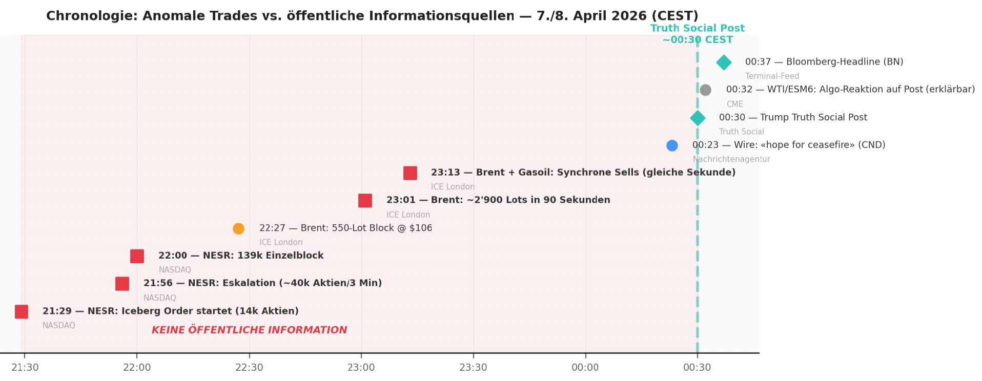 Entscheidend: Zum Zeitpunkt dieser Trades (23:01-23:13 CEST) existiert keine öffentliche Nachricht, die einen derart aggressiven Verkaufsdruck in Energiemärkten rechtfertigen würde.