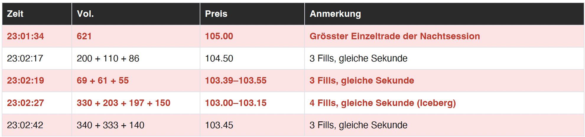 Um 23:01:34 CEST wird ein einzelner Sell-Block von 621 Kontrakten bei USD 105.00 ausgeführt. In der folgenden Minute (23:02) werden mindestens 14 weitere grosse Trades registriert: