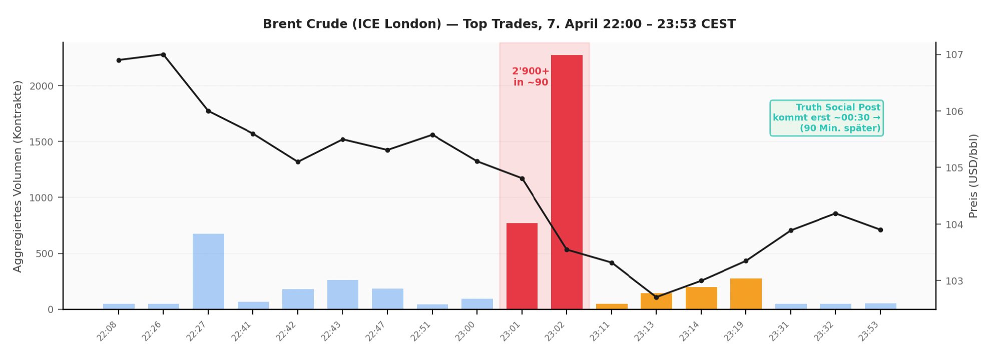 Brent-Trades um 23:01 CEST: Welche Marktteilnehmer haben 90 Minuten vor dem Truth-Social-Post über 2’900 Brent-Kontrakte (~USD 300 Mio.) verkauft? Weder Nachrichten-Algos noch öffentliche Quellen liefern eine Erklärung für dieses Timing.