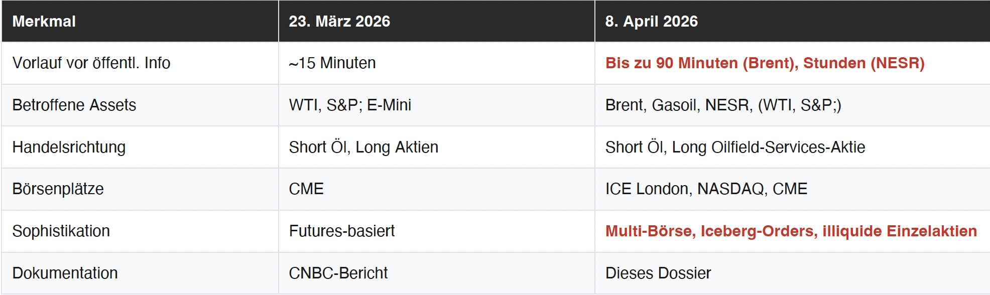Diese Muster sind konsistent mit einem am 23. März 2026 von CNBC dokumentierten Vorfall, bei dem anomale Volumen-Spikes vor einer Trump-Ankündigung zu Iran nachgewiesen wurden.