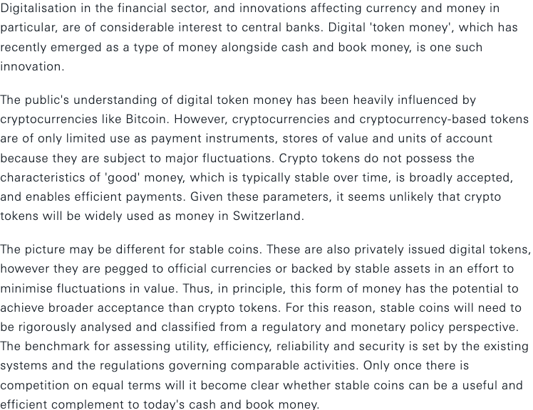 „The picture may be different for stable coins“, fuhr der damalige SNB-Chef fort.