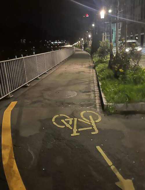 Und zwei Velostreifen, einer auf jeder Strassenseite.