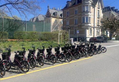 Dort sind die neuerdings violett gespritzen Publibikes der Stadt abgestellt.