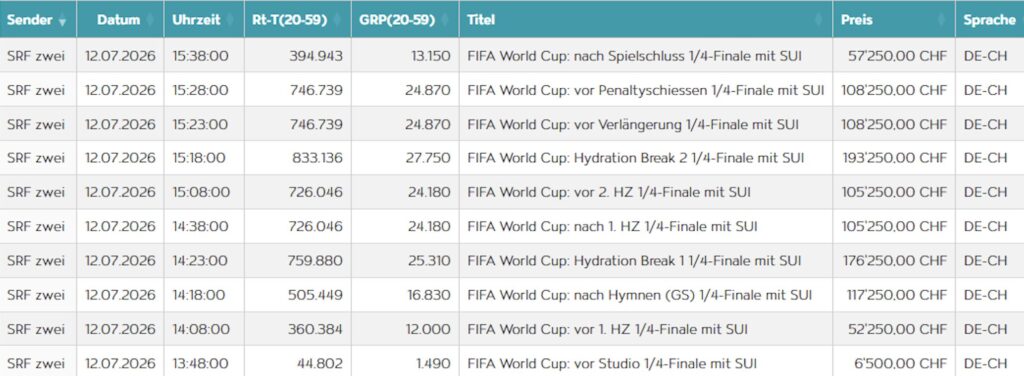 SRF hat damit den Preis für die teuersten Unterbrechungen im Vergleich zur EM 2024 verdoppelt. Damals kostete der kostspieligste Spot 95’250 Franken.