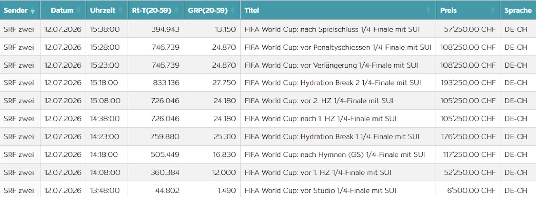 Eine halbe Minute Werbung kostet im Final bis zu 170’000 Franken, wie eine Tabelle des TV-Vermarkters Admeira zeigt.