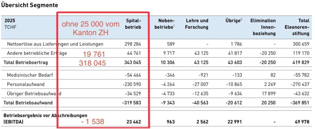 Die im Spitalwesen viel beachtete EBITDA-Marge liegt somit leicht unter 0 Prozent.