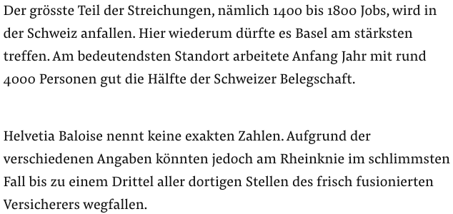 „Aufgrund der verschiedenen Angaben könnten jedoch am Rheinknie im schlimmsten Fall bis zu einem Drittel aller dortigen Stellen des frisch fusionierten Versicherers wegfallen.“