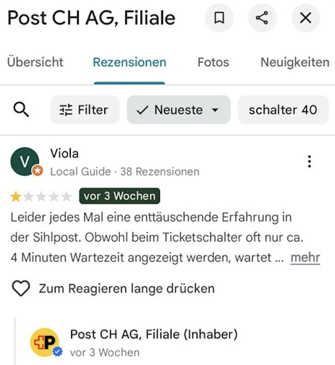 Während Millionen unter anderem in Videoschalter und schicke Partnerzonen fliessen, bleibt die Post bei den Öffnungszeiten im letzten Jahrhundert hängen. Um 18:30 Uhr ist in der Regel bei eigenen Filialen Schalterschluss.