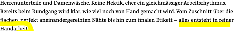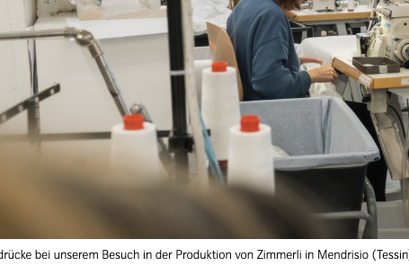 Unter einem Foto mit Näherinnen steht: „Eindrücke bei unserem Besuch in der Produktion von Zimmerli in Mendrisio (Tessin).“ Und weiter: „Alles entsteht in reiner Handarbeit.“