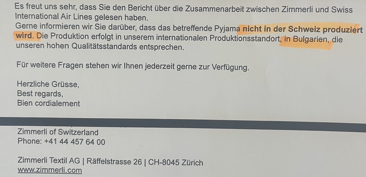 Damit ist klar: Die Swiss-Marketing-Verantwortlichen behaupten steif und fest, die neuen Zimmerli-Stücke für die wichtigsten Fluggäste würden in der Qualitätsnation Schweiz hergestellt.
