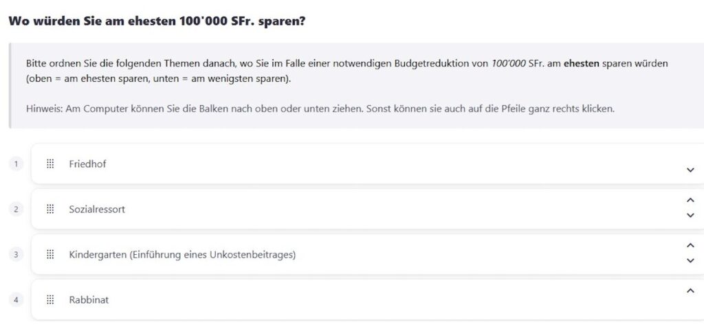 Diese Woche erhielten die 2’500 Mitglieder eine Email: Wo soll man sparen? Lieber beim Rabbi oder beim Friedhof? Lieber beim Kindergarten oder beim Sozialdienst? Bitte ankreuzen.