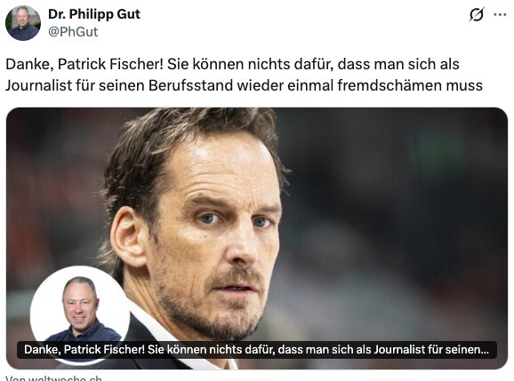 Die Weltwoche leistet Sukkurs. „Danke, Patrick Fischer!“, so Redaktor Philipp Gut. „Sie können nichts dafür, dass man sich als Journalist für seinen Berufsstand wieder einmal fremdschämen muss.“