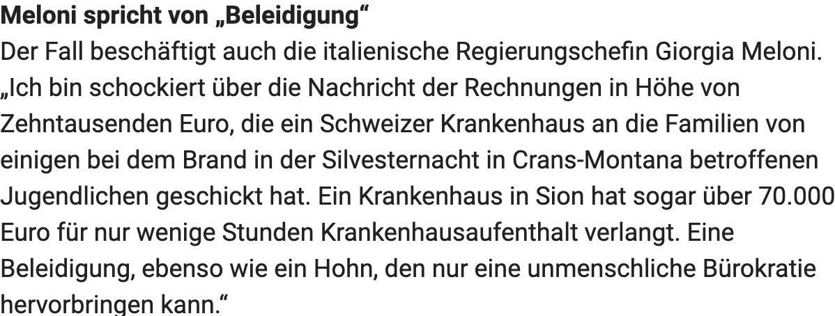 75’000 Euro für 15 Stunden Behandlung beeindruckend, wie schnell gewisse Stellen reagieren können, wenn es ums Kassieren geht. Schade, dass dieselbe Effizienz bei der Sicherheit in Crans‑Montana offenbar nicht existierte.