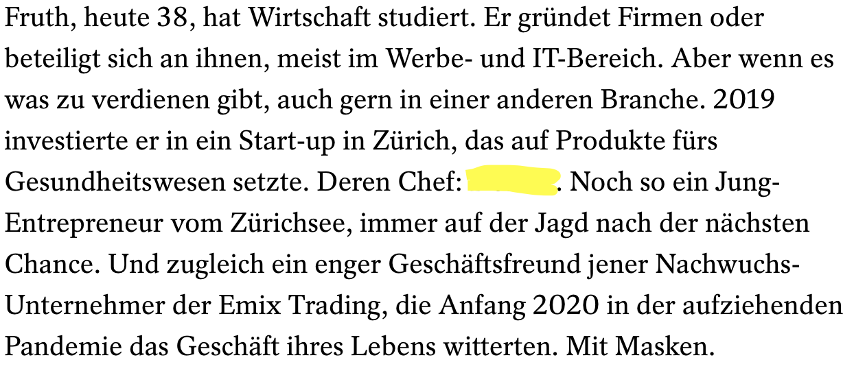 Er kannte jenen Werber, der in München Türen zu einer Bekannten aufstossen konnte, die wiederum den Deal des Jahrhunderts zu Beginn der Covid-Panik im 2020 ermöglichte.