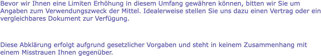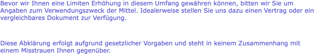 „Bevor wir Ihnen eine Limiten Erhöhung in diesem Umfang gewähren können, bitten wir Sie um Angaben zum Verwendungszweck der Mittel.“