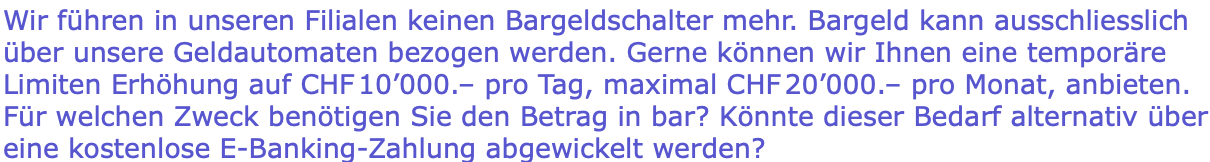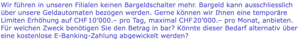 Dann kams: „Für welchen Zweck benötigen Sie den Betrag in bar? Könnte dieser Bedarf alternativ über eine kostenlose E‑Banking‑Zahlung abgewickelt werden?“
