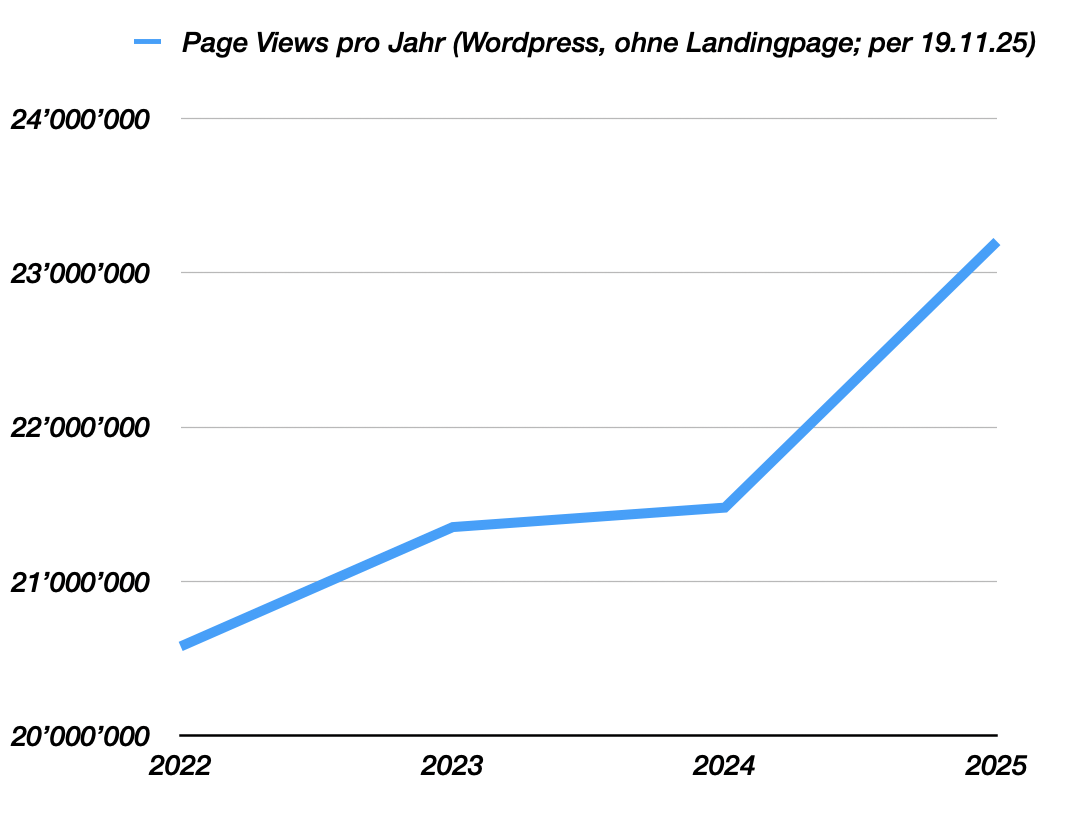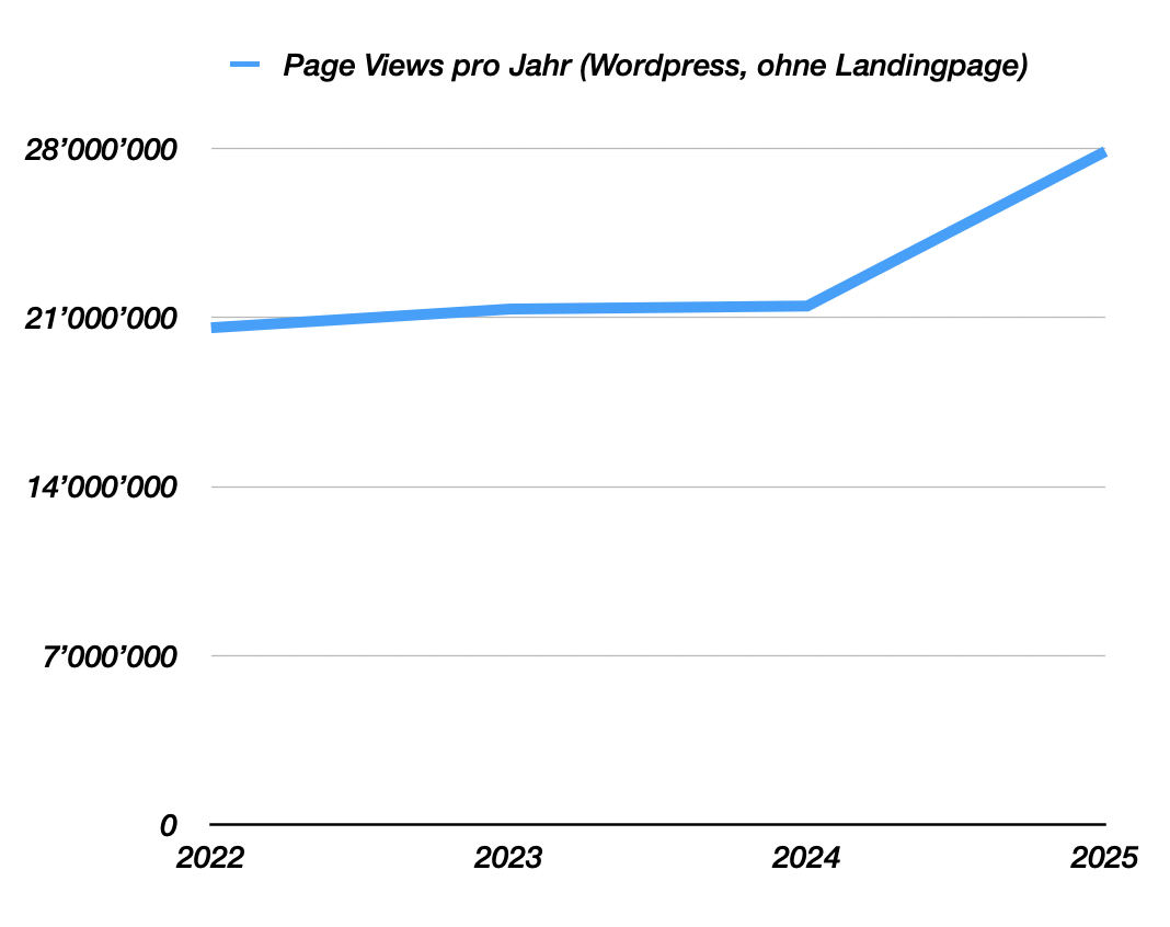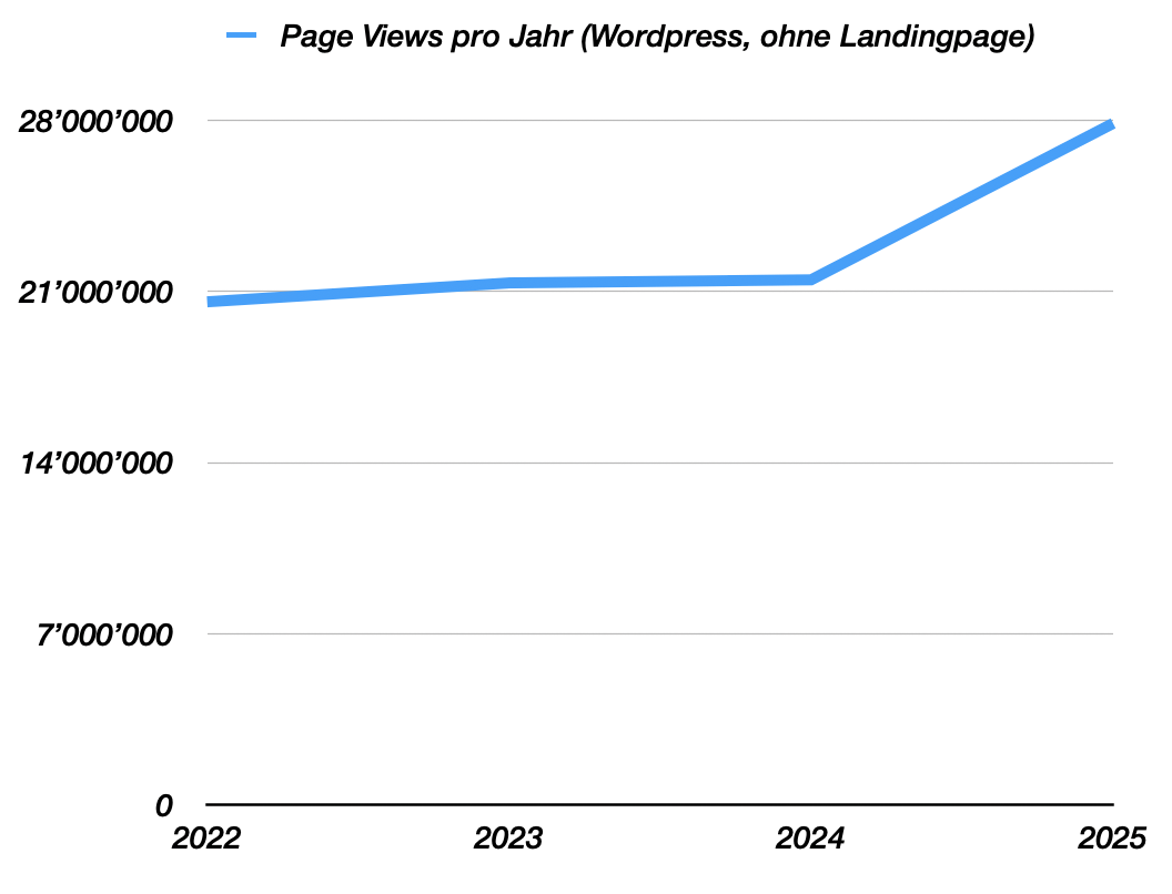 2025 lasen per Ende Oktober 61 Prozent die Artikel auf ihrem Mobilgerät, während 35 Prozent aller IP-Seitenaufrufe auf dem Desktop stattfanden und die restlichen 4 Prozent von den Tablets stammen.